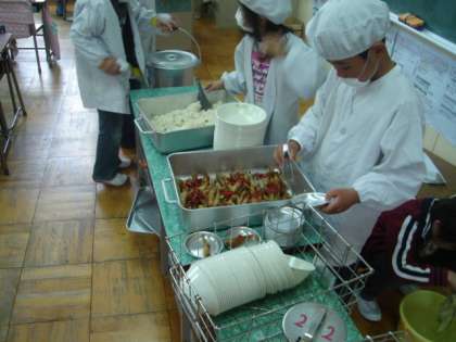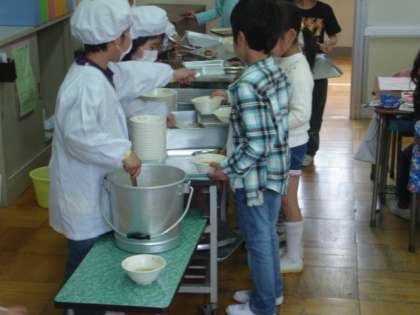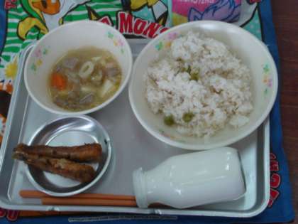 今日のメニューはにぎすのピリカラフル、味噌けんちん汁、
