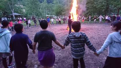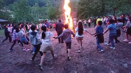 手に手をとっての、マイムマイム。元気のよい掛け声が広がっています。