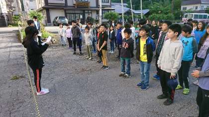 宿舎の前で2日目の朝会を行いました。「昨日はぐっすり眠れた?」の問いに、半数が手をあげ、何人かが「ちょっと…」でした。