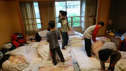 6時、起床の時間です。「昨夜は?」の問いに、「よく眠れた」と返す子が多数。男子は、ご覧のように片付けをしています。