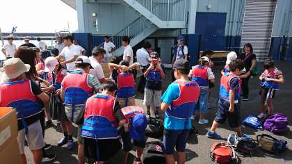 ライフジャケットを着て、乗船準備です。子供たちを乗せる船が待っています。