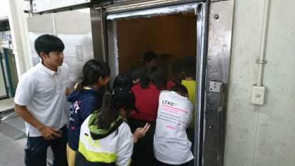 由比漁港での最後の学習は、冷凍庫体験です。マイナス30度の世界に1分弱入ります。扉を閉めると中からは、悲鳴の数々。扉が開くと、「キャー」と共に、駆け出してきました。