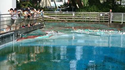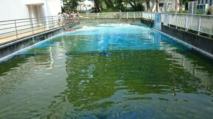 模型を使い、10センチメートルの津波を起こします。これは、実際には10メートルを超えるもの。堤防の有無で、被害の違いがわかります。