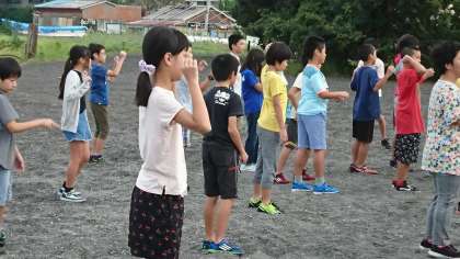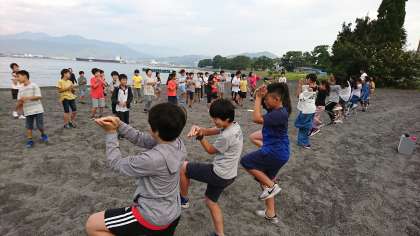 予定どおり、宿舎近くの浜辺で朝会を行いました。眠い体を起こして、みんなで「パプリカ」です。