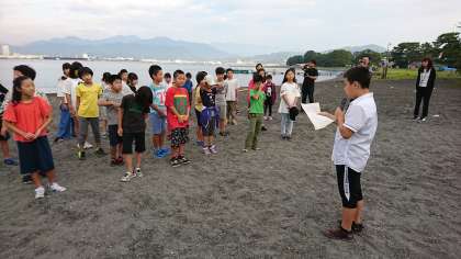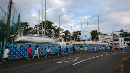 宿から5分ほど歩くと、三保マリーナがあります。朝会は、ここで。列の乱れもなく、一列で向かいます。