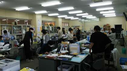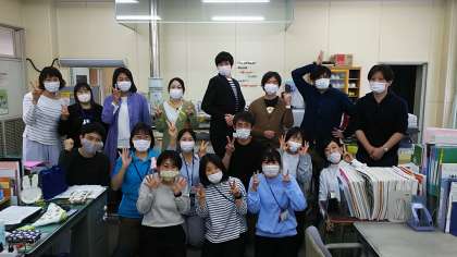 こうちょうせんせいの しもゆぎしょういいところみつけ。さいしゅうかいです。さいごの いいところは、もういちど「しょくいんしつ 」から、せんせいたちの ようすを しょうかい します。みんなに あえない まいにち ですが、いま できることを はなしあい がんばって います。せんせいたちは こうちょうせんせいが しんらい する ちからづよい なかまです。みんな なかよし です。いそがしく している ところ ですが、さいごに しょくいんしつの うしろに あつまって みんなで しゃしんを ぱちり!