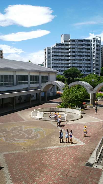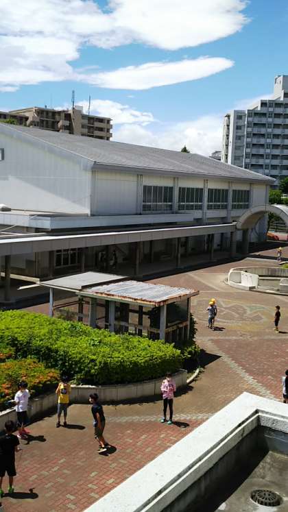 中休みの中庭です。暑いので、無理せず過ごすように伝えています。教室は換気中。子供たちも外に出て、風に当たりながらリフレッシュ中です。