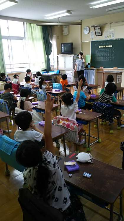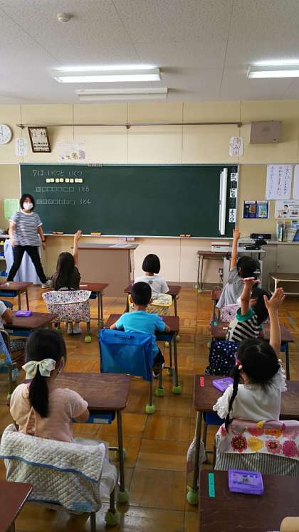 [1年生算数]7は、いくつといくつですか?算数ブロックを使いながら考えます。「はーい!」とよく手が挙がって「1と6です。」「3と4です。」・・・では黒板を見て気が付くことはありませんか?「はーい!」「階段みたいになっています!」・・・なるほど。