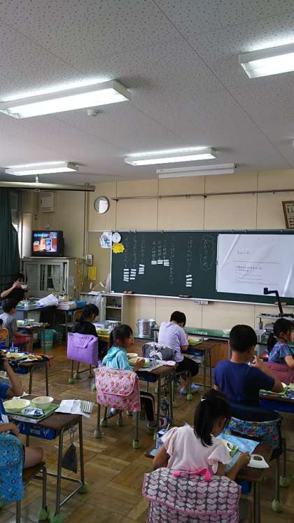 [2年生給食]さすが2年生、準備もすばやくできました。今日から牛乳がビンではなく紙パックに変わりました。「いただきます」をして、食べながら、その後片付け方法を伝える動画の放送を待っているところです。