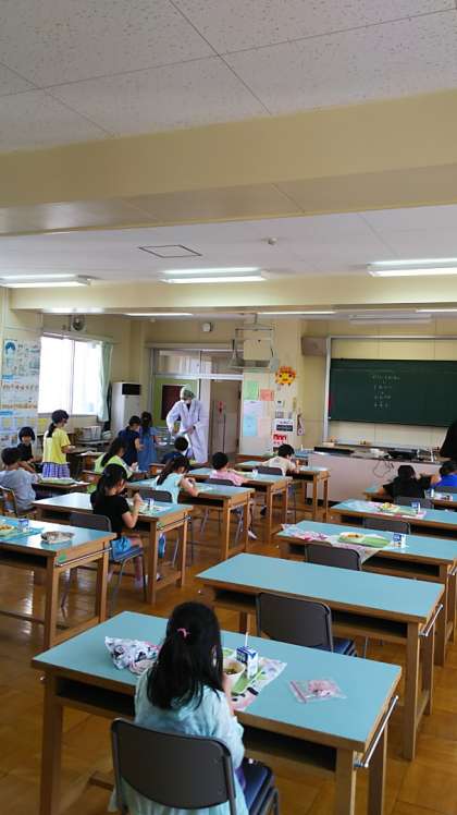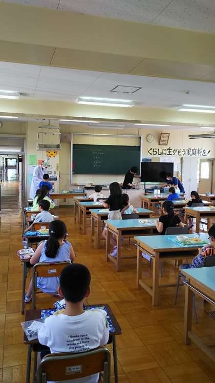 [3年生給食]人数の多い3年生は教室ではなく、広い家庭科室で給食を食べます。家庭科室の大きな机に一人ずつ座ります。いつもと違う雰囲気ですね。
