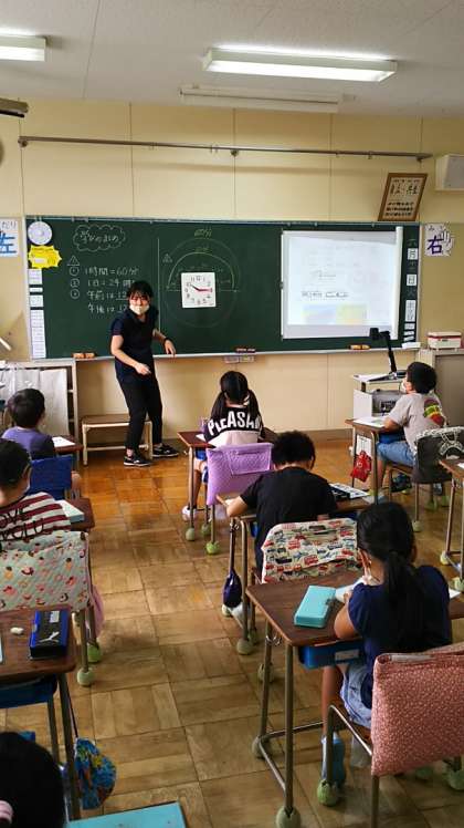 [2年生算数]「時こくと時間」の学習です。1時間は60分、1日は24時間であることをしっかり押さえてから問題に取り組みます。「午前10時15分の30分後は?」