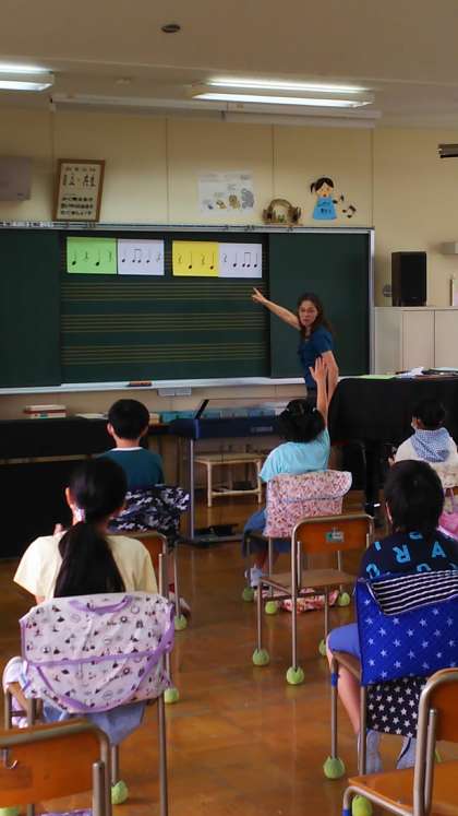 [4年生音楽]4分音符、8分音符、4分休符の学習です。みんなでメロディに合わせて楽しく手拍子。音楽室は広いので、できるだけ距離を空けながら授業をしています。