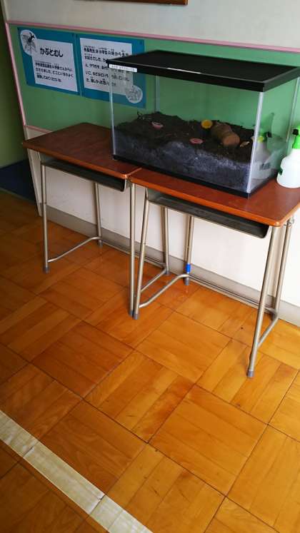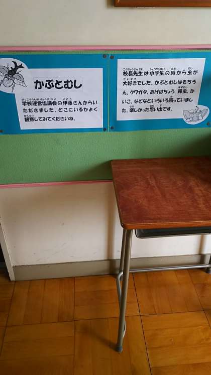 学校運営協議会の委員さんからカブトムシをいただきました。そこで早速、校長室前にカブトムシコーナーを作りました。私は小学生の頃、昆虫大好き少年でした。夏の夜、近所の森へ行き、カブトムシやクワガタを捕まえるのが、何よりの楽しみでした。子供たち喜んで見てくれるかな。