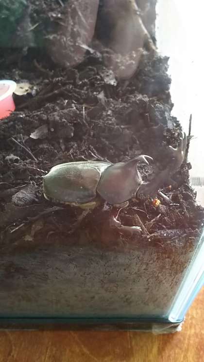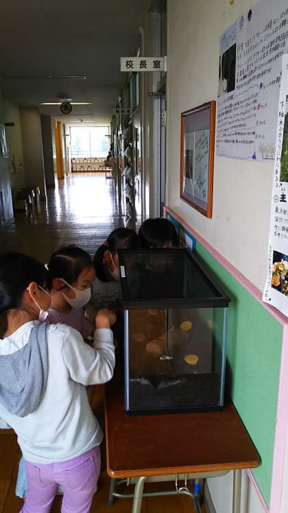 休み時間に子供たちがカブトムシを取り囲んで見ています。「オスが2匹メスが3匹いるよ」と告げると、みんな夢中で探していました。「うちでも飼ってるよ」「今度もってこようか」「名前つけないの?」と盛り上がりました。