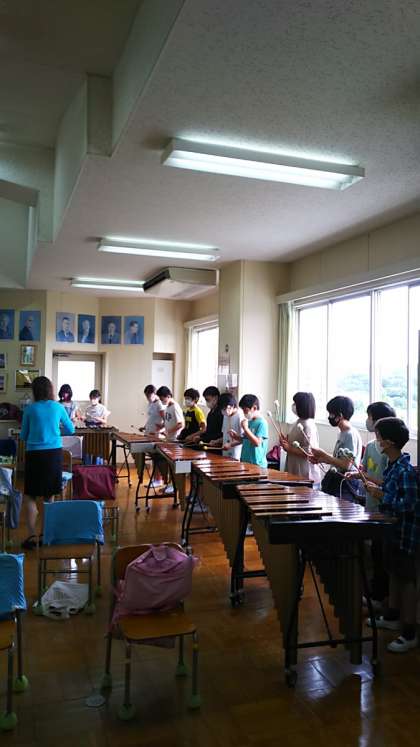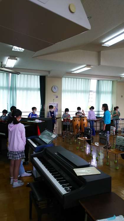 [5年生音楽]「ラ バンバ」の演奏です。木琴、鉄琴、グロッケン、シロフォン、バス木琴、キーボード、ピアノ、バスマスター、コンガ、ボンゴ、シンバル、大だいこ、ギロ、マラカスの大合奏です。さすが高学年。