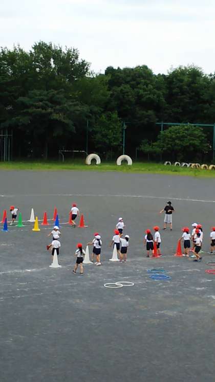 [2年生体育]今日は雨も降らず、それほど暑くもなく、体育の授業にはもってこいの天気です。午後の校庭では2年生が楽しそうに走っています。2階の廊下からそっと見ていたら「あっ校長先生だ!」と見つかってしまいました。