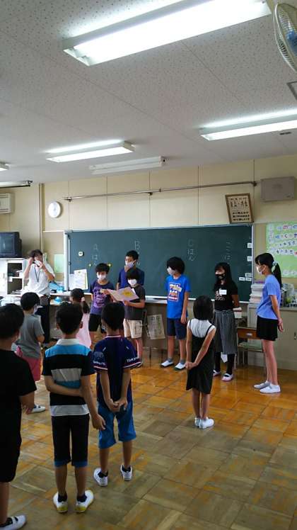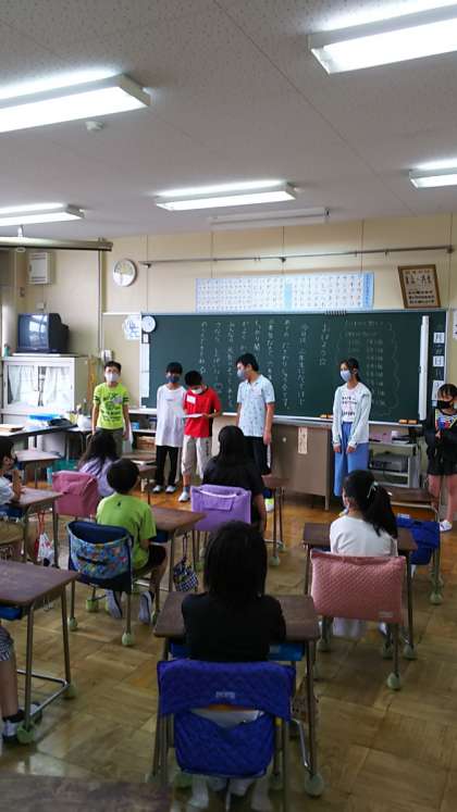[たてわり班活動]今朝は今年度初めての「たてわり班活動」です。全校児童が学年を解体した8つの班に分かれ、異年齢交流活動を行うのが「たてわり班活動」です。今年は1学期に休業期間があったためこの時期になりました。