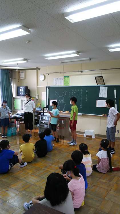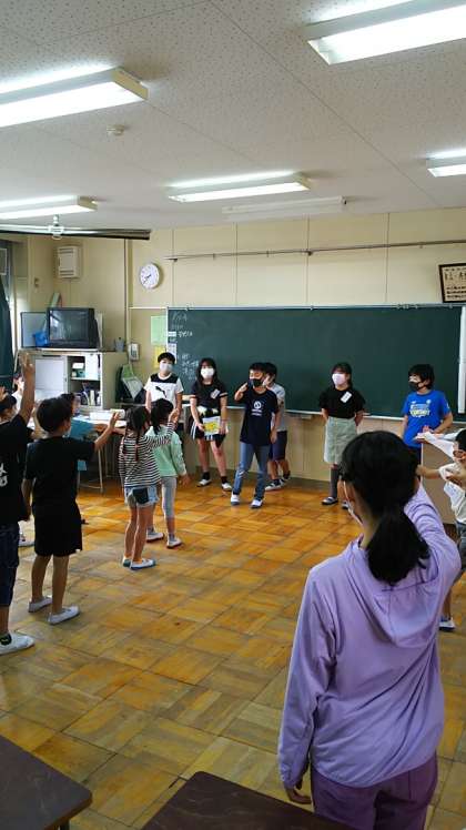 [たてわり班活動]初めて集まったメンバーを6年生が上手にまとめながら集会を進行していきます。早く仲良くなれるといいですね。早速ちょっとしたゲームをしている班もありました。