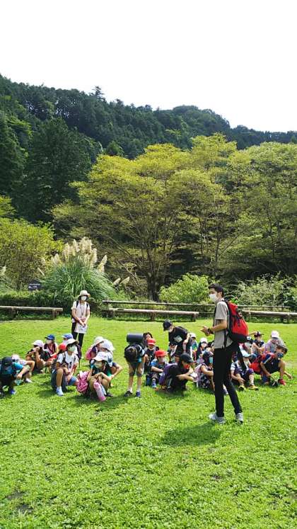 [3年生]広い芝生に到着しました。周りの緑がとてもきれいです。芝生の先にはきれいな北浅川が流れています。同じ八王子市でも南大沢付近とは様子がかなり違います。八王子は広いです。