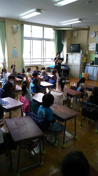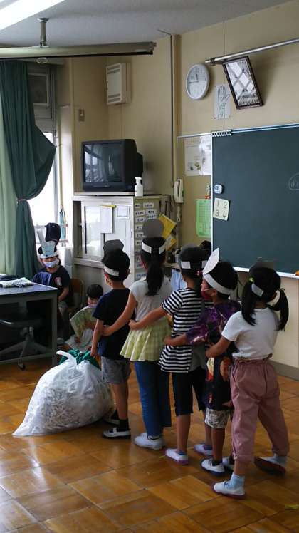 [1年生国語]「おおきなかぶ」の音読発表会をしています。おじいさんや おかあさんや ねこや ねずみに扮して「うんとこしょ! どっこいしょ!」と楽しく演じることができました。発表を見た後で友達の良かったところを伝え合いました。