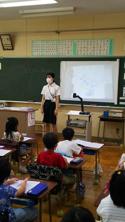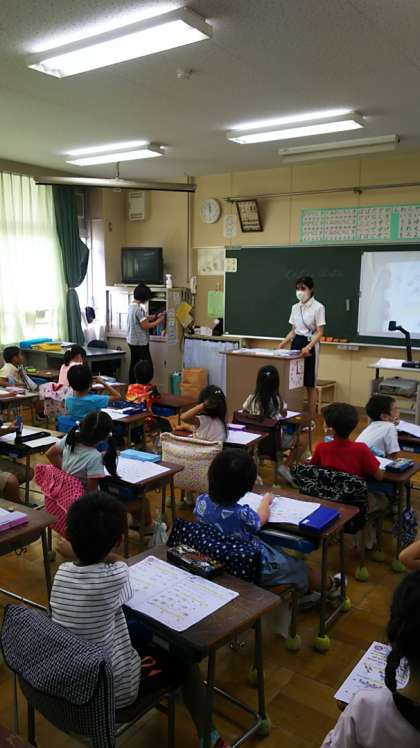 [1年生算数]教育実習の先生が授業をしています。三十数年前の私もやりました。教師なら必ず通ってきた道です。1年生のみんな、先生の話をよく聞いてがんばっています。子供たちも先生もがんばれー!という気持ちで見守る校長です。