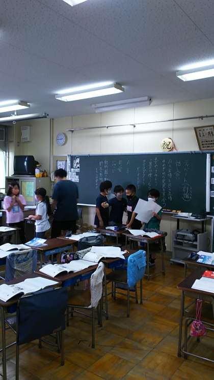 [5年生国語]討論会(ディベート)の準備をしています。異なる立場で議論することで、説得力を高める工夫が身に付きます。また相手の立場に立って物事を考える力にもなります。本番は清水移動教室から帰ってきた後で行うそうです。今からしっかりと打ち合わせです。