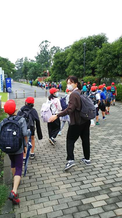 [4年生]ここは同じ東京都でも八王子と違う低地です。目の前は海です。昔、大きなごみ捨て場だった「夢の島」。今はきれいに整備され、スポーツ施設が点在する大きな公園になっています。先生の腰には消毒液がぶら下がっています。