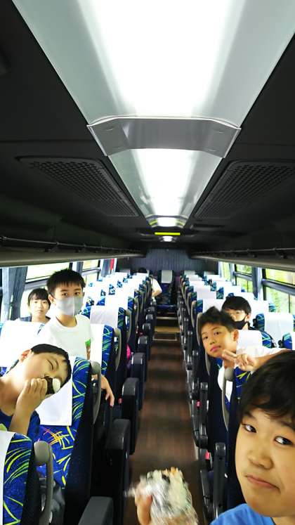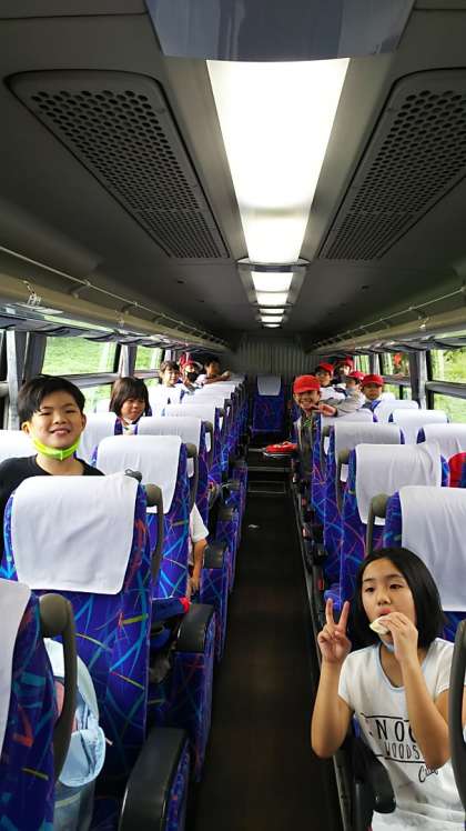 [4年生]小雨が降っているため、バスの運転手さんにお願いして、お弁当はバスの中で食べることにしました。写真撮るよ〜と言うと、おいしそうな顔が並びました。