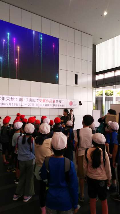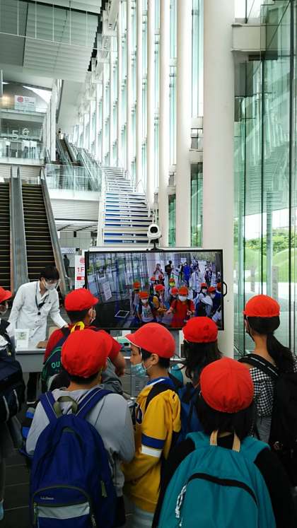 [4年生]昼食の後は、日本科学未来館に来ました。未来をつくる日本の科学技術を楽しみながら感じることができる施設です。入口の検温モニターに感動しているみんなでした。校長は35.9度でした。