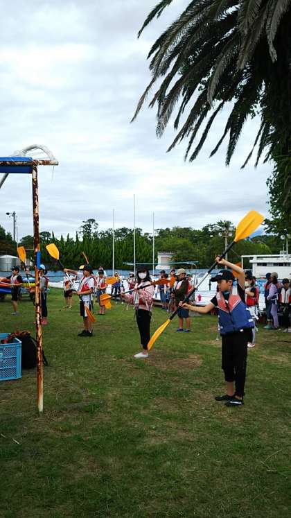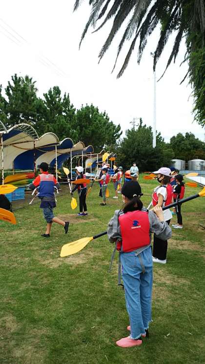[5年生]天気予報を考慮してカヌー体験を先にやることにしました。まずはパドルの練習です。進み方、止まり方、回り方を教えてもらいます。