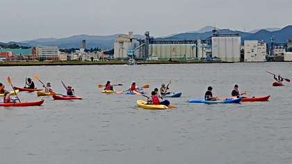パドルの練習をして、海にこぎ出しました。最初は不安な様子でしたが、浜に帰ってくるなり