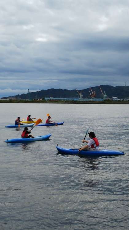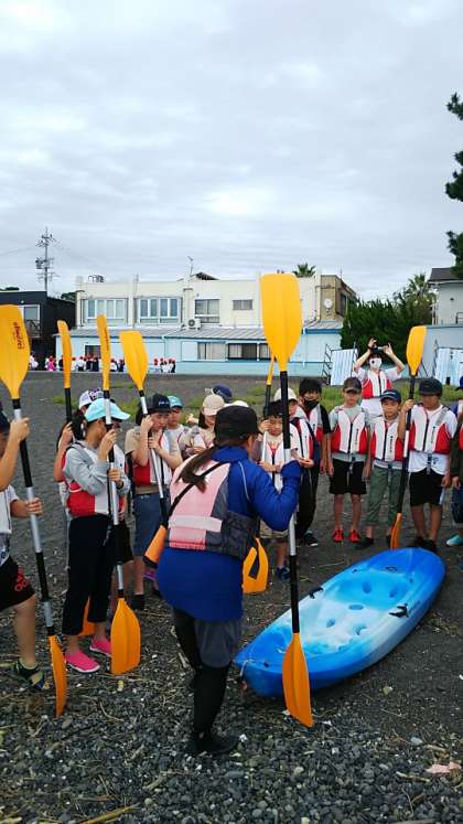 [5年生]さあ海に向かって漕ぎ出します。1艇を3人で順番に使います。不安そうにしていた子も、いざやってみるとみんな楽しそうです。