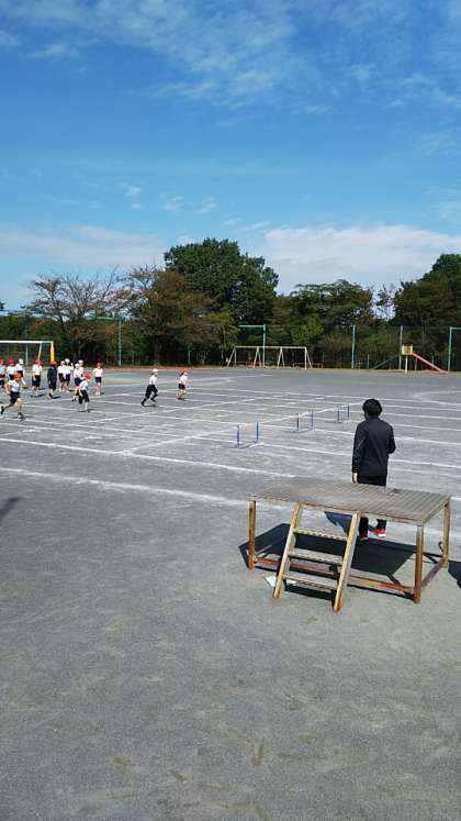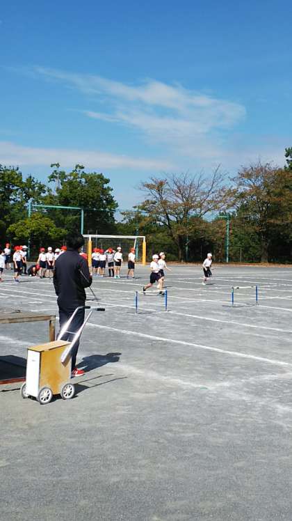 [5年生体育]ハードル走です。上手にハードルを跳ぶこつは、いつも同じ足で跳ぶことができるように、ハードル間のリズムを一定して走ることです。「1、2、3、トン」の調子です。