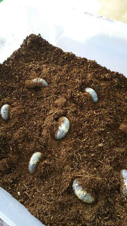 用務主事さんが冬に備えてカブトムシケースに通気穴のついた手作りのふたを作ってくれました。寒さ対策も万全です。早速、栄養が補充された新しいマットに自分で元気にもぐっていく幼虫たちです。