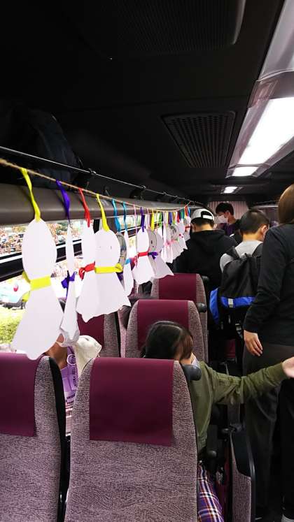 [6年生]7:25 お見送りのみなさんに手を振って出発です!車内にはみんなが作ったてるてる坊主がぶらさがっています。