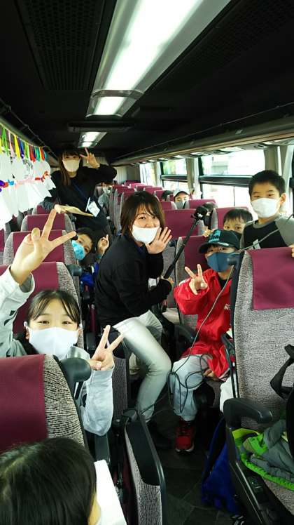 [6年生]8:45 バスの中では楽しい時間を過ごしています。レク係やガイドさんがクイズを出して盛り上がっています。