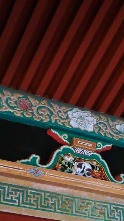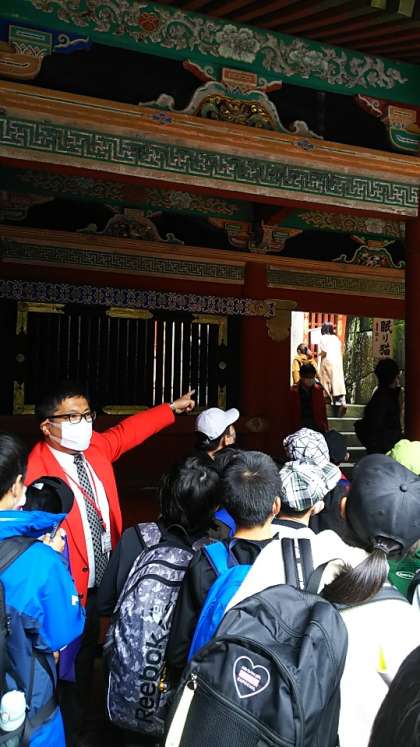[6年生]14:30 伝説的彫刻職人、左 甚五郎作「眠り猫」です。意外と小さいのですが、やっぱり人気者ですので見学は長蛇の列でした。国宝の猫です。