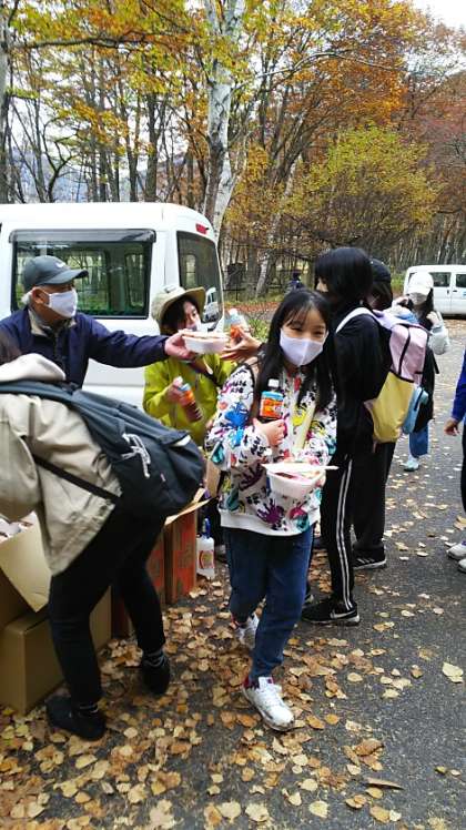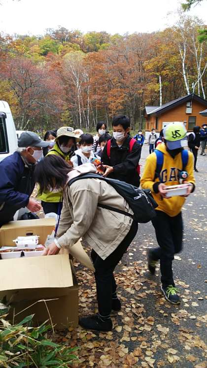 [6年生]12:15 手を洗って、消毒して、おにぎり弁当とお茶をもらいます。林の中に敷物しいてみんなで「いただきます」をしましょう。