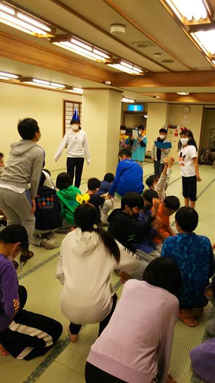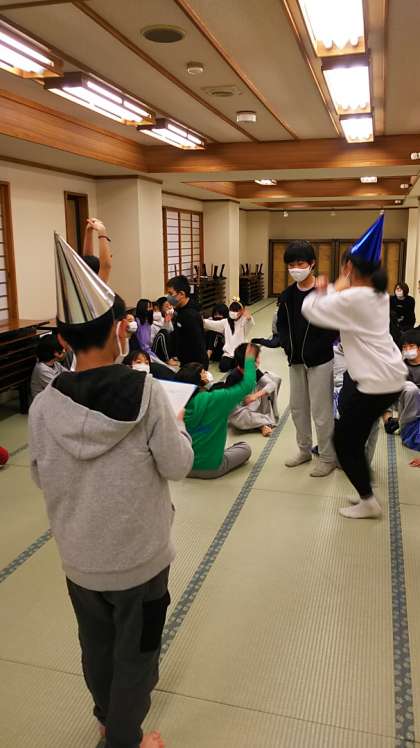 [6年生]19:00 学年レクは係の司会によってテンポよく進められます。6年生の子たちの良さは、仲の良さとノリの良さです。まるばつゲームはなかなかの難問でした。