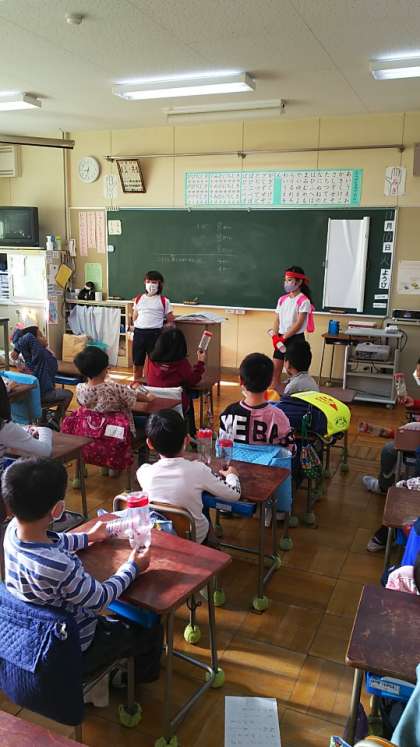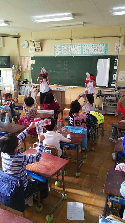 朝の時間、応援団のメンバーが各教室に行き、今年の運動会の応援方法を伝授しています。感染予防のため、みんなが大きな声を出すことはできません。ペットボトルを使った新しい応援方法です。