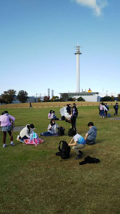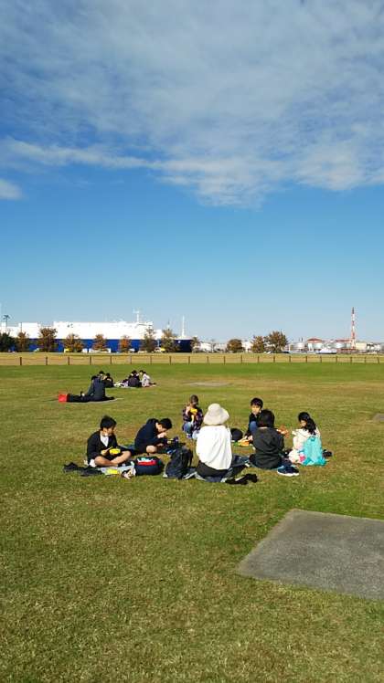 [5年生]空が広いと感じる公園です。下柚木小以外は誰もいません。さあ敷物しいてお弁当を食べましょう。