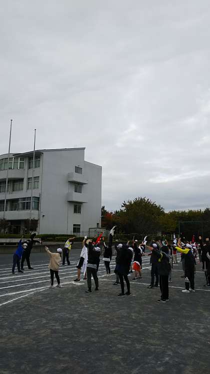 準備運動や児童席への退場を確認しています。寒い朝ですが、みんなきびきび行動しています。
