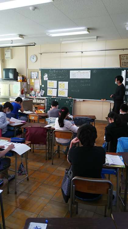 [5年生算数]「単位量あたりの大きさ」の学習です。10畳に6人、8畳に5人など大きさの違う4つの部屋の混み具合を比べています。どこが一番混んでいるか調べる方法を考えます。