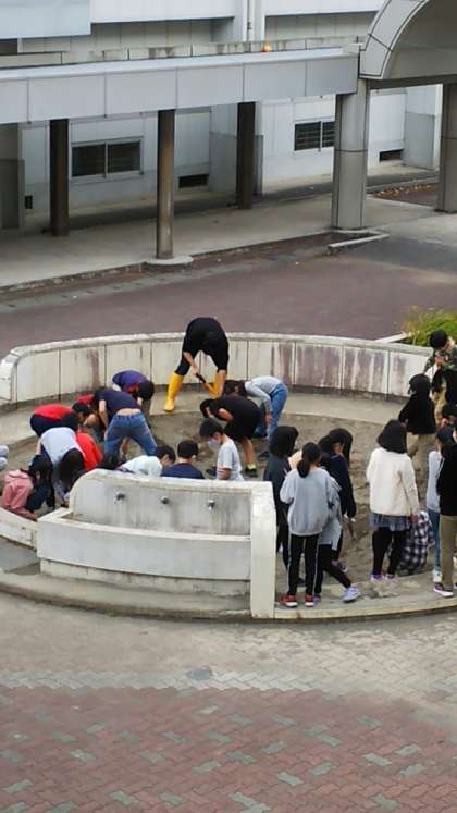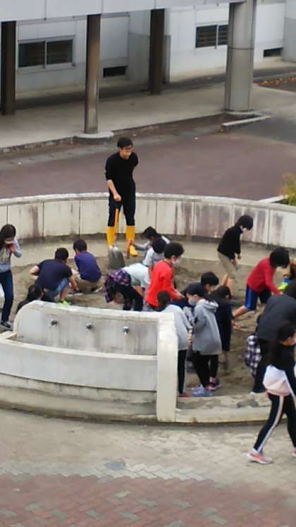 [5年生理科]えっ、5年生が砂場遊び?いえいえ、ちゃんとした理科の実験です。「流れる水のはたらき」の学習です。まずはみんなで水路をつくります。