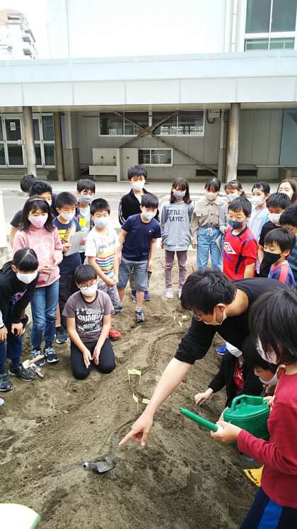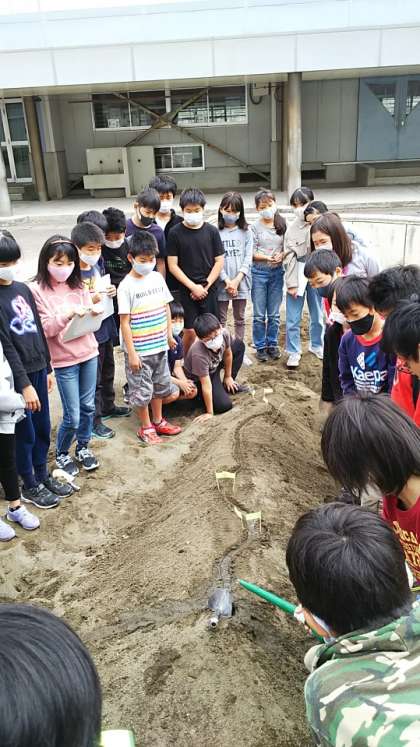 [5年生理科]さあ水を流します。流れの様子からどんなことに気が付くかな。立てた旗はどうなるかな。