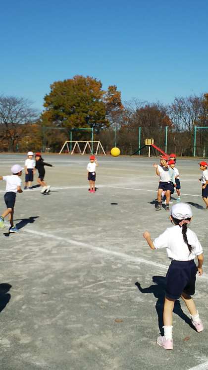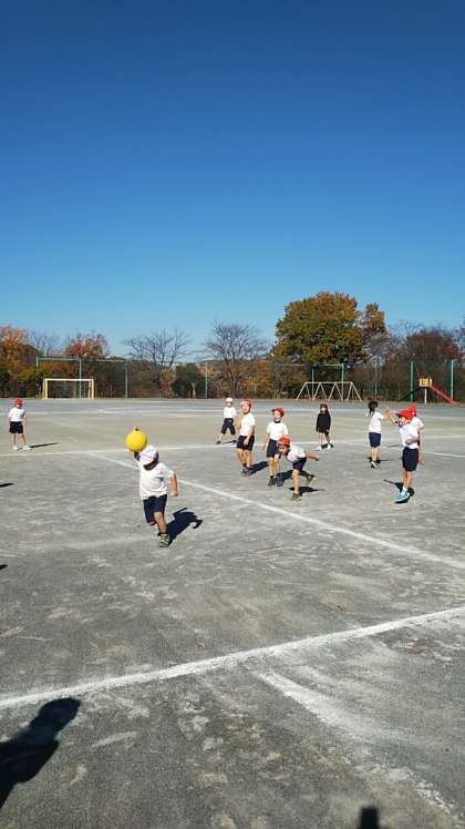 [1年生体育]縄跳びの練習の後でみんなお楽しみのドッジボールです。投げたり取ったり避けたり、だんだんとゲームが様になってきました。