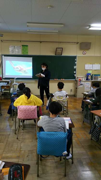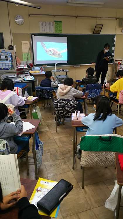 [4年生国語]「ウミガメの命をつなぐ」を読んでいきます。黒板には大きくウミガメが映し出されています。先生の範読を静かに聞いています。