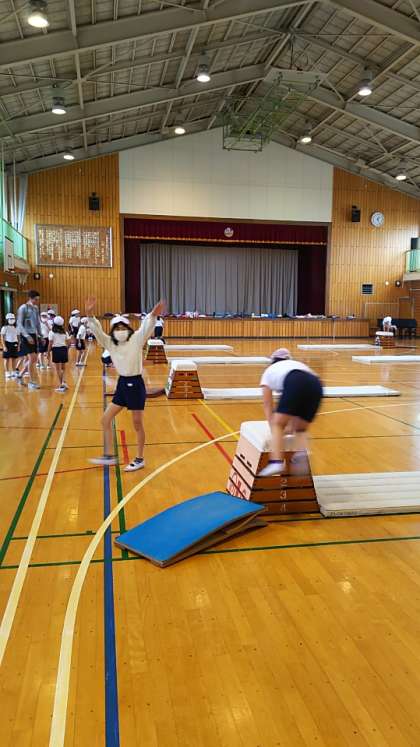 [3年生体育]跳び箱の学習です。いろいろと跳び箱の置き方を工夫しながら練習しています。子供たちを励ましながらアドバイスをしている先生の声が響いています。