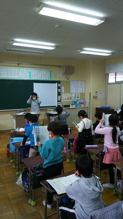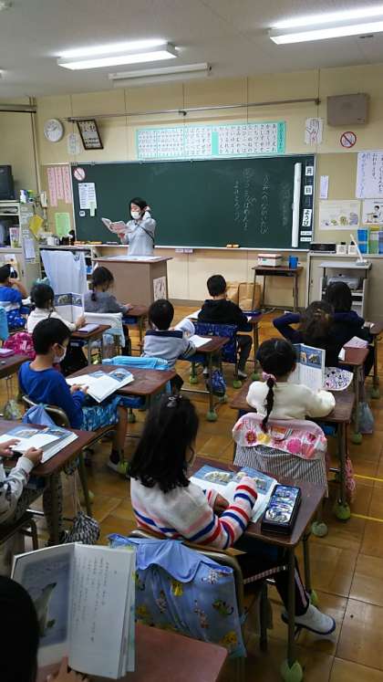 [1年生国語]「うみへの ながい たび」を読んでいます。先生の範読に続いて子供たちが声を会わせて音読しています。