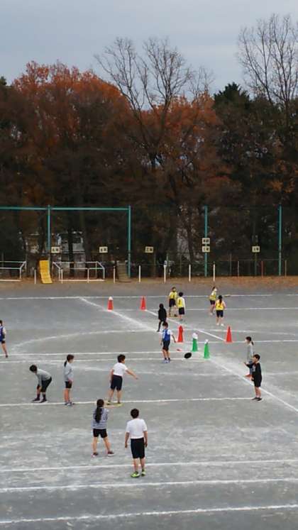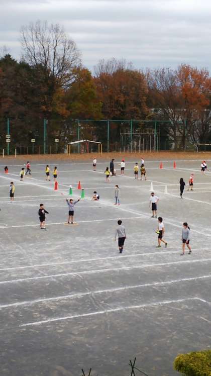 [5年生体育]校庭でアルティメットをやってます。ディスクを投げてパスをしていき、エンドゾーンの味方にパスが通ると得点になります。投げるものの違いはありますが、アメリカンフットボールやポートボールに似ています。
